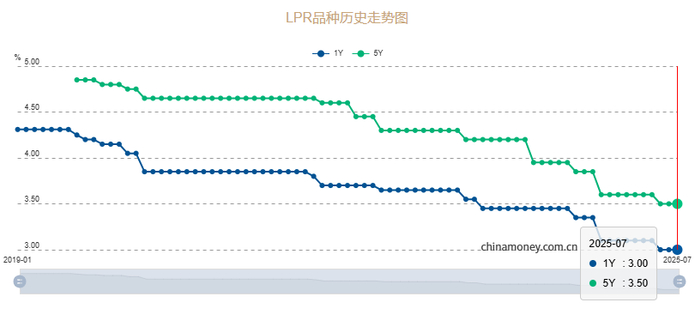 今日(7月21日),央行公布2025年7月LPR:5年期以上LPR为3.5%,1年期LPR为3.0%,均与上月保持不变。