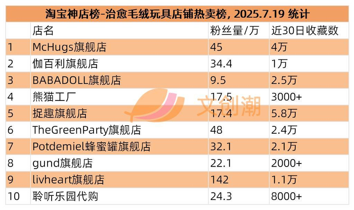 治愈毛绒玩具店铺热卖榜,前五名分别是: