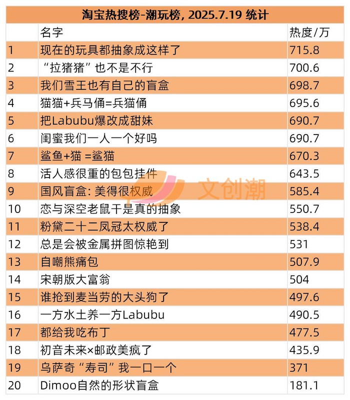 淘宝热搜潮玩榜,每日实时更新,文创潮7月12日统计到的前五名分别是:现在的玩具都抽象成这样了、“拉猪猪”也不是不行、我们雪王也有自己的盲盒、猫猫+兵马俑=兵猫俑、把Labubu爆改成甜妹。