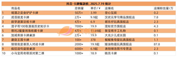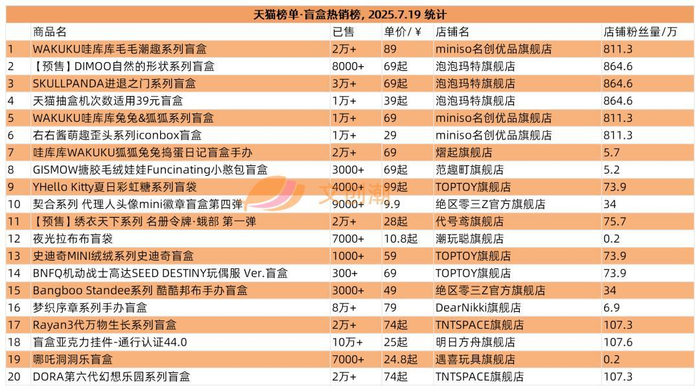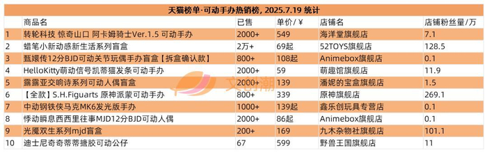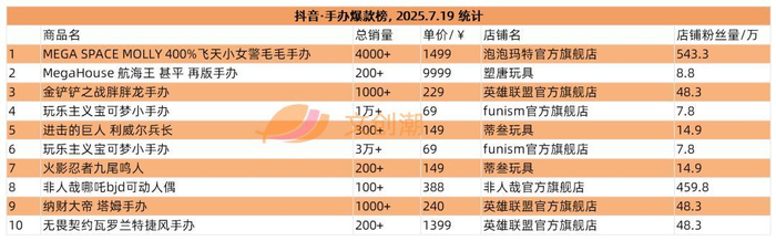 抖音平台榜单实时更新,文创潮7月19日统计到的盲盒、手办、卡牌三大品类的爆款前五名,如图所示。