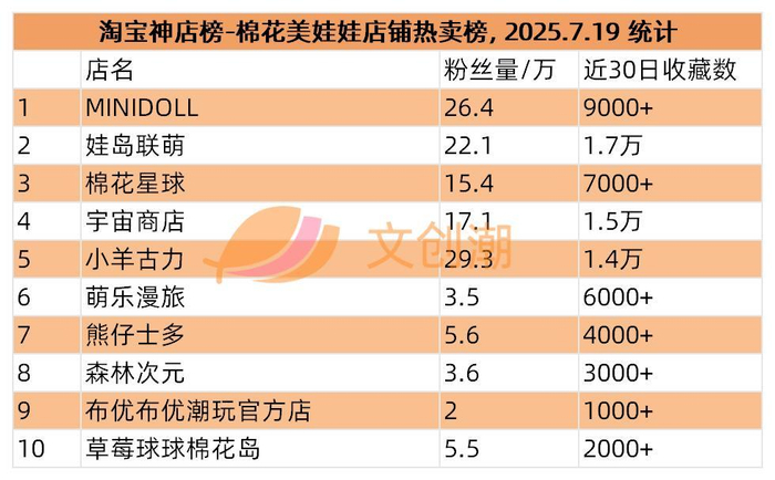 棉花美娃娃店铺热卖榜,前五名分别是: