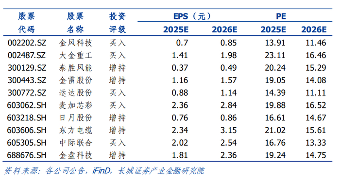 投资建议:随着沿海省份 2025 年海风重点项目清单陆续公示,风电招投标市场火热,一季度以来产业链排产出货良好。欧洲 2024 年度资源核准授予容量同比增速较高,陆上和海上风电有望迎来高增。大型化趋势和新技术的应用打开整机发展空间,产业链零部件企业也将受益于海风建设提速和海外市场拓展的需求提振。随着大兆瓦新产品的推出,主机环节降本工作持续推进,盈利能力有望边际向好,重点推荐金风科技、运达股份;随着需求改善,塔筒管桩产能利用率和单吨盈利同步提升,重点推荐区域优势明显,海外市场开拓顺利和订单获取能力较强的大金重工、泰胜风能;铸锻件环节重点推荐如金雷股份、日月股份等大兆瓦铸锻件市占率较高且海外客户产品认证工作顺利推进、产能较为充足的供应商;风电向深远海迈进将显著提升对行业领先海缆企业高电压等级产品的需求,重点推荐区位优势显著及有望进一步取得突破的企业,如东方电缆;其他零部件环节重点推荐海外市场布局长久,产品认可度和市占率高,大客户关系持久稳定的企业,如金盘科技、中际联合、麦加芯彩。