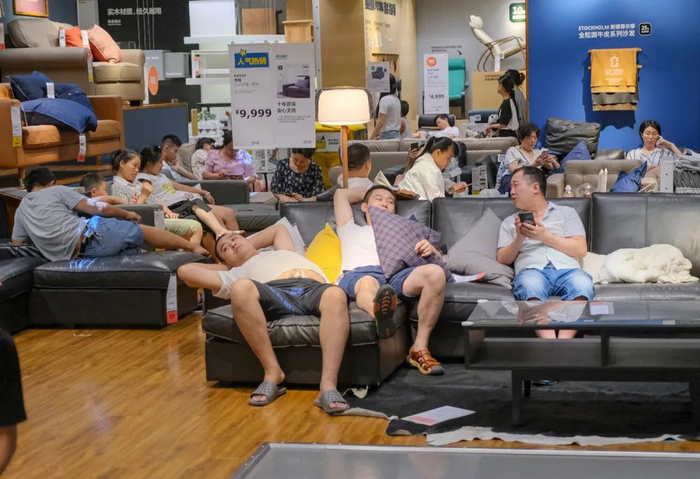 不少人选择去商场、家居店、银行、地铁站休闲纳凉,其中几乎每年夏天都成为“重灾区”的宜家商场,此时此刻有人拖家带口在体验区床铺上睡午觉,有人拖鞋甩了一地,有人则旁若无人将商场当成自家卧室……