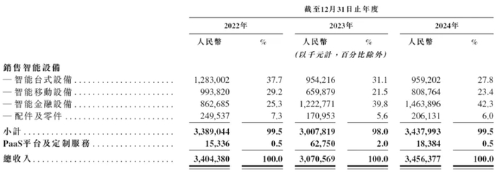 另一方面原因是业务结构单一:其中来自销售智能商用设备的收入占比均在95%以上。2022年~2024年,商米科技销售智能设备的收入分别为33.89亿元、30.08亿元和34.38亿元,占当期总营收的比例分别为99.5%、98%和99.5%。软件服务板块虽当前占比不足1%。