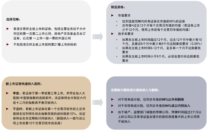 需要注意的是,今年以来恒生指数公司优化了其指数检讨中对于样本12个月平均市值的计算方法(从过去12个月每月月底平均市值优化为过去12个月每个非停牌交易日的平均市值)及长时间停牌标的梳理方式(复牌前的市值及流动性数据将会被排除在测试计算之外)。