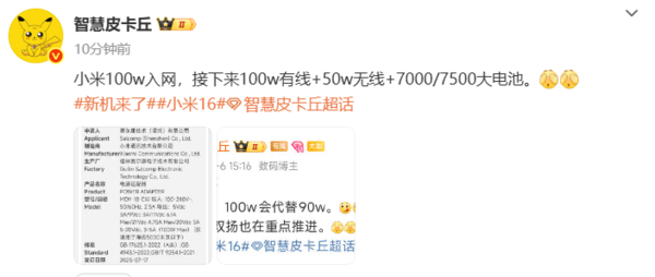 【CNMO科技消息】7月21日,有博主曝光了疑似小米16系列的续航参数。他透露,小米手机的100W有线充电器已入网,预计接下来的新机还将搭载50W无线充电和7000mAh或7500mAh大电池。从话题标签来看,这里的新机很可能是小米16系列。