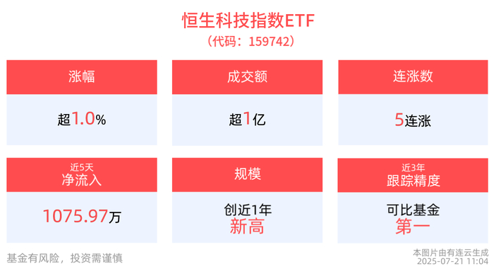 恒生科技指数ETF(159742)涨超1%冲击5连涨,恒生科技指数上周涨超5.5%,市场对港股科技板块呈乐观情绪
