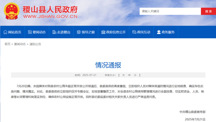 7月20日晚,央视媒体对该县农村公厕未能正常开放公开报道后,县委县政府高度重视,立即组织人员对媒体报道的情况进行实地核查,确实存在此类问题,情况属实。对此,县委县政府立即组织召开专题会议,安排部署整改工作,对全县农村公厕使用管理情况进行全面排查,切实把资金、人员、制度等长效管理机制落实到位,确保农村公用设施正常开放。同时县纪委监委对相关失职失责人员进行严肃追责问责。