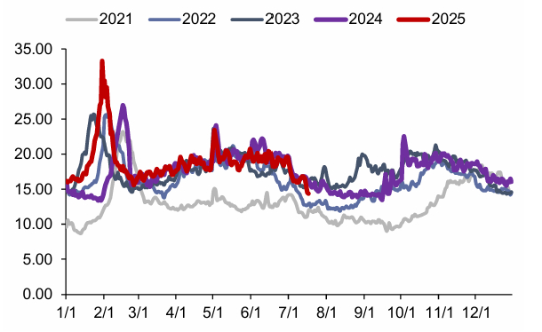 截至7月18日,上海石油天然气交易中心LNG出厂价格全国指数为4455元/吨(约合3.18元/方),同比下降3.63%,环比下降0.11%;2025年6月,国内LNG进口平均价格为513.98美元/吨(约合2.63元/方),同比下降5.57%,环比上升1.02%。截至7月17日,中国进口LNG到岸价为12.36美元/百万英热(约合3.26元/方),同比上升0.28%,环比持平。