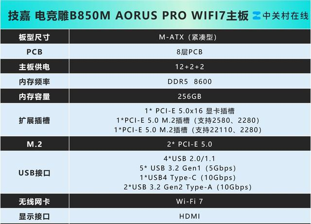 第二款是可以适配AMD平台的技嘉电竞雕B850MAORUS PRO WIFI7主板,同样先来看看参数。