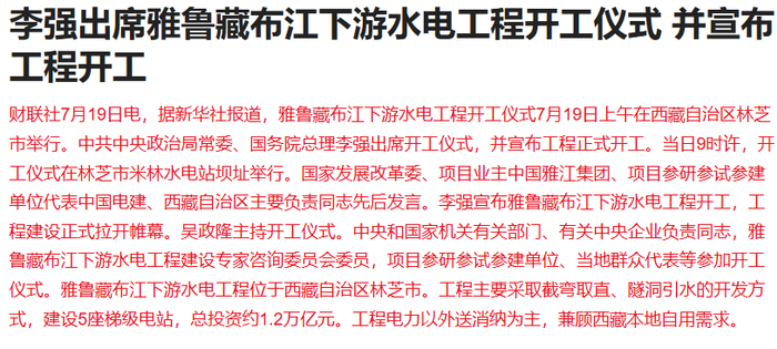 消息面上,雅鲁藏布江下游水电工程开工仪式于7月19日上午在西藏林芝举行。国务院总理李强出席仪式并宣布工程正式开工。国家发展改革委、项目业主中国雅江集团、承建单位代表中国电建集团及西藏自治区主要负责人分别发言。