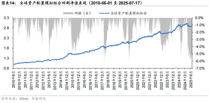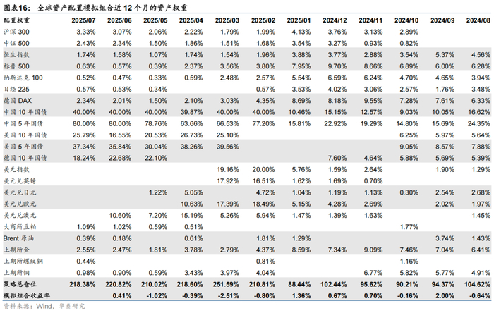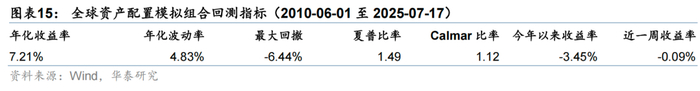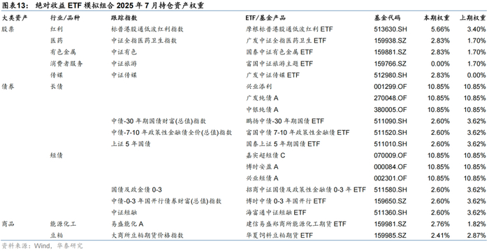 下表展示了绝对收益ETF模拟组合2025年7月持仓资产,权益内部持有红利风格ETF以及医药、有色金属、消费者服务等相关行业ETF,商品内部持有能源化工、豆粕相关ETF。模拟组合中权益资产仓位显著抬升,主要是时序动量角度对于A股观点由持平转向看多。