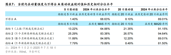 6月23日以来,A股连续四周偏强势运行,本轮指数上涨是否存在内在力量支撑?后期行情是否可延续?市场内在动量的强弱往往对后续走势存在较强的指示性,我们构建“个股涨跌成交额占比差”、“新高新低成交额占比差”等四项指标,从微观角度刻画市场内生动力。从方向来看,近期市场内在动量持续抬升,尚未出现拐点,上行趋势清晰;从强度来看,万得全A近20日滚动收益处于2024年以来约89%分位,四项内在动量指标则分布在历史81%–95%分位区间,表明内在“隐性”动量与指数层面的“显性”涨幅匹配度较高,指数上涨存在内在力量支撑,后续行情延续概率较高。