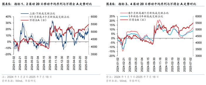 其中,前两个指标侧重刻画当日到近一个月窗口内的短期强弱势状态,后两个指标侧重刻画六个月到一年内的长期强弱状态。指标原始值波动较为剧烈,我们将指标做20日移动平均处理后展示,2024年以来指标走势如下。可以看出,内在动量的强弱对市场走势存在较强的指示性,如2024年10月至2024年12月上旬,指数高位震荡过程中,市场内在动量快速下行,后续市场上行乏力,12月中下旬出现回调;2025年3月中上旬指数上行,但内在动量偏弱,3月下旬指数出现下跌。