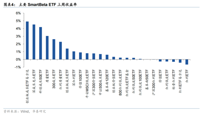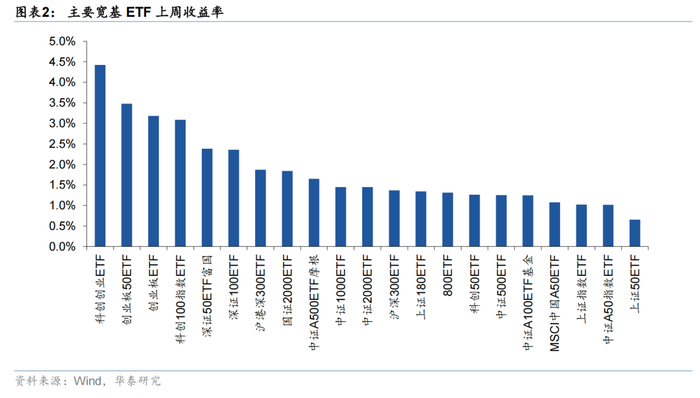 上周A股市场延续强势,上证指数等多个宽基创下年内新高,创业板指上周涨幅最高,达3.17%,其次为微盘股、深证成指和小盘股指数。从风格上来看,成长、小盘风格上周持续占优:1)宽基ETF中,科创板和创业板相关产品涨幅居前,科创创业ETF、创业板50ETF和创业板ETF上周涨幅排名前三;2)SmartBeta ETF中,成长相关ETF上周表现持续占优,相关产品的周度收益率均高于红利、低波类ETF产品;3)行业ETF中,上周英伟达H20对华恢复销售,带动AI算力链情绪回暖,通信ETF上周强势上涨9.86%,其他板块中,医药、计算机、家电、电子等行业ETF表现较好,周涨幅近3%,上上周领涨的房地产ETF则出现回调。