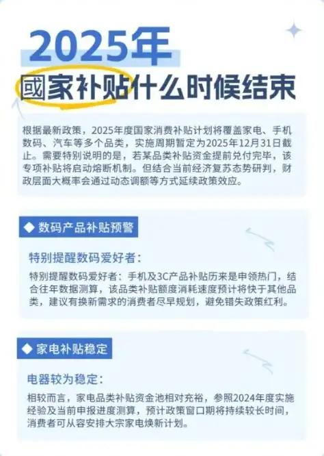 - 2025 年手机家电国家补贴结束时间:2025 年 12 月 31 日。