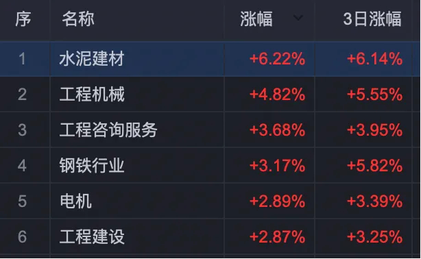 热门板块方面,水泥建材、工程机械、钢铁、电机等板块领涨。