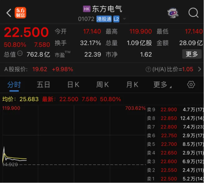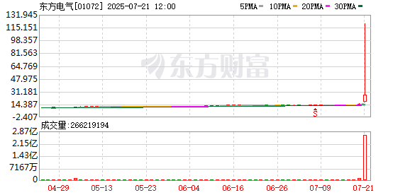 A股东方电气开盘涨停。港股东方电气盘初一度涨超700%,随后急速回落,现涨超50%。