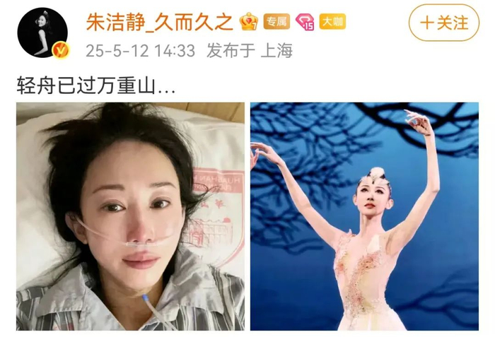 当天,朱洁静在个人社交平台晒出躺在病床上的流泪照与舞台上的舞蹈照,并配文:轻舟已过万重山。