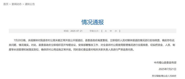 7月21日,山西稷山县委宣传部发布情况通报称,7月20日晚,央视媒体对我县农村公厕未能正常开放公开报道后,县委县政府高度重视,立即组织人员对媒体报道的情况进行实地核查,确实存在此类问题,情况属实。
