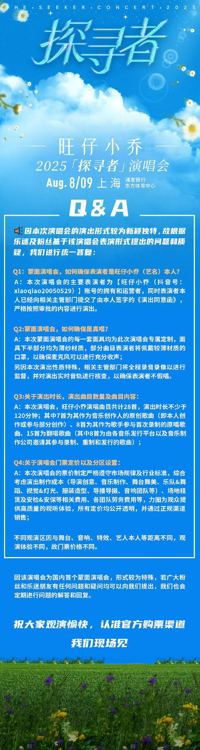 7月21日凌晨,演出主办方华纳音乐北京对此次演唱会的争议进行回应。主办方承诺演出会严格按照审批内容进行,保证表演的人就是旺仔小乔账号的拥有者和运营者,蒙面演唱会的每一套面具均为定制,下半部分为薄纱材质,确保麦克风可以充分收声,相关主管部门会全程录音录像进行监督,确保表演者不假唱。本次演出旺仔小乔将演唱28首歌曲,其中7首为本人创作或参与部分创作的,8首是其作为歌手参与首次录制的原唱歌曲,15首翻唱歌曲。演唱会的门票定价和分区设置严格遵守市场规律和行业标准,综合考虑演出制作成本,所有定价公开透明。