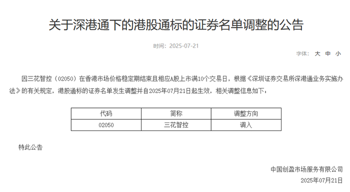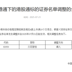 7月21日,深交所公告,因三花智控(02050)在香港市场价格稳定期结束且相应A股上市满10个交易日,根据《深圳证券交易所深港通业务实施办法》的有关规定,港股通标的证券名单发生调整并自2025年7月21日起生效。