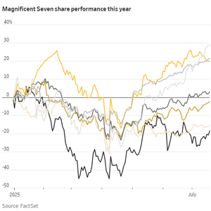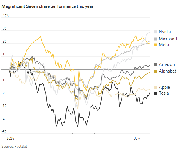 目前,“七巨头”确实仍牢牢掌控着市场。它们的股票在4月份引领了由关税战引发的抛售,然后又帮助市场一路回升至创出新高。根据道琼斯市场数据,“七巨头”的市值目前约占标普500指数总市值的35%,投资者预计这一情况不会很快改变。