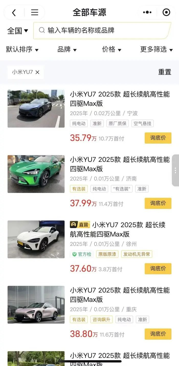 近百辆小米YU7流入二手车市场,百公里准新车加价1万起