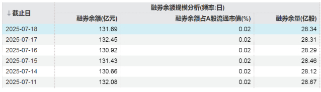 截至7月18日,A股市场融券余额为131.69亿元,上周融券余额减少0.39亿元,融券余量为28.34亿股。