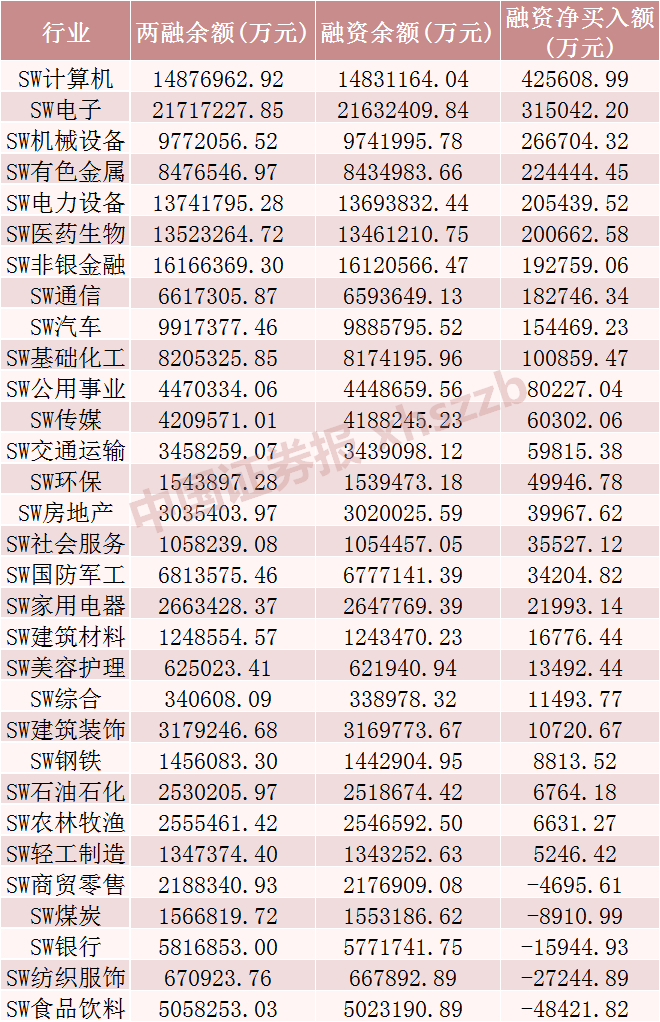 从行业情况来看,上周申万一级31个行业中有26个行业融资余额增加,计算机、电子、机械设备行业融资净买入金额居前,分别为42.56亿元、31.50亿元、26.67亿元。在融资余额减少的5个行业中,食品饮料、纺织服饰、银行行业融资净卖出金额居前,分别为4.84亿元、2.72亿元、1.59亿元。
