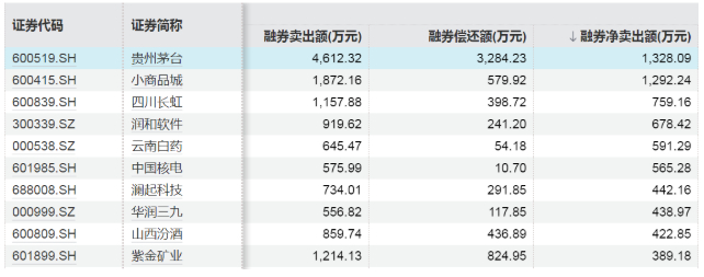上周融券净卖出额居前的股票为贵州茅台、小商品城、四川长虹,分别为1328.09万元、1292.24万元、759.16万元。
