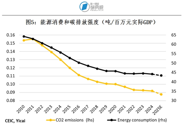 2010至2019年,能源消费和碳排放占实际GDP的比例均迅速下降(图5)。从那以后,中国经济能源强度只是略有下降。减排的大部分收益来自于对低碳型能源结构的投资。