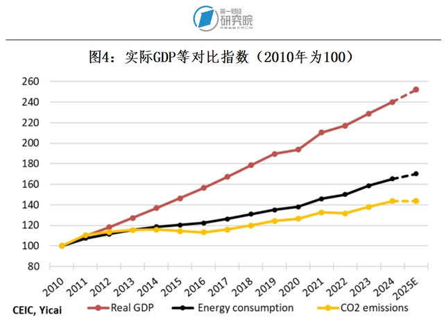 为了实现减排目标,中国正在朝两个方面努力——既要降低GDP的能源强度,又要降低能源供应的碳强度。过去15年来,中国在这两个方面都取得了重大进展。假设今年中国GDP增长5%,碳排放量保持在124亿吨,能源需求增长3%,那么与2010年相比,中国的实际GDP将增长150%,而能源消费仅增长70%,碳排放仅增长44%(图4)。