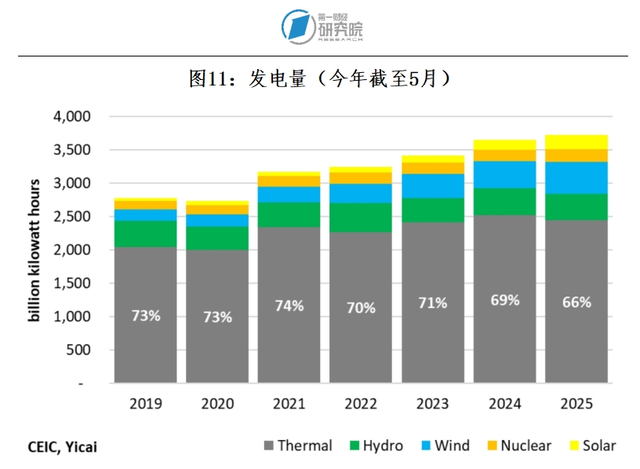 从截至今年5月份的数据来看,预计今年的排放量会下降似乎是合理的。与2024年前五个月相比,发电量同比增长了2%。然而,火力发电同比下降了2%。相比之下,太阳能发电同比增长了41%,风力发电同比增长了17%。今年到目前为止,中国66%的电力来自火力发电。与前几年相比,这一比例急剧下降(图11)。