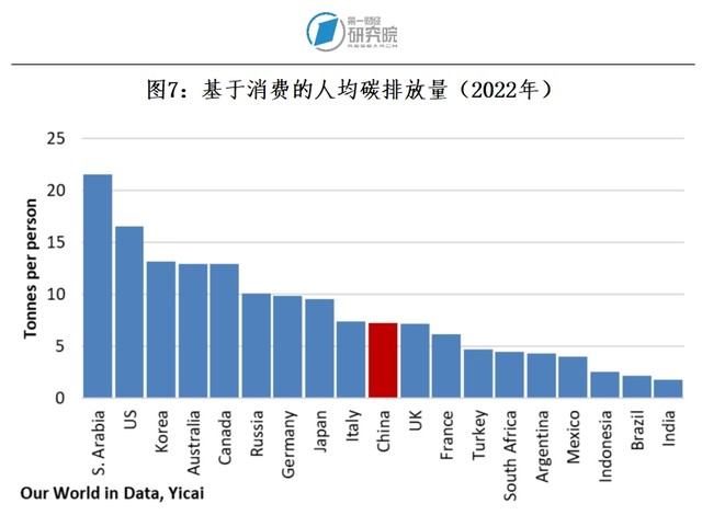 到目前为止,中国仍是世界上最大的二氧化碳排放国。2023年,中国的碳排放量占全球总量的近三分之一,与欧洲、美国和俄罗斯大致相同(图6)。