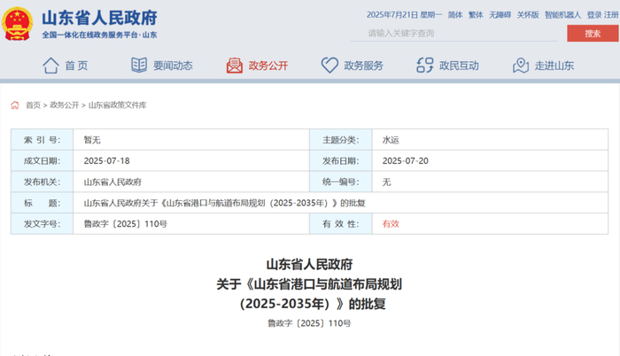 7月20日,山东省政府网站发布山东省人民政府关于《山东省港口与航道布局规划(2025-2035年)》的批复,原则同意《山东省港口与航道布局规划(2025-2035年)》(以下简称《规划》)。