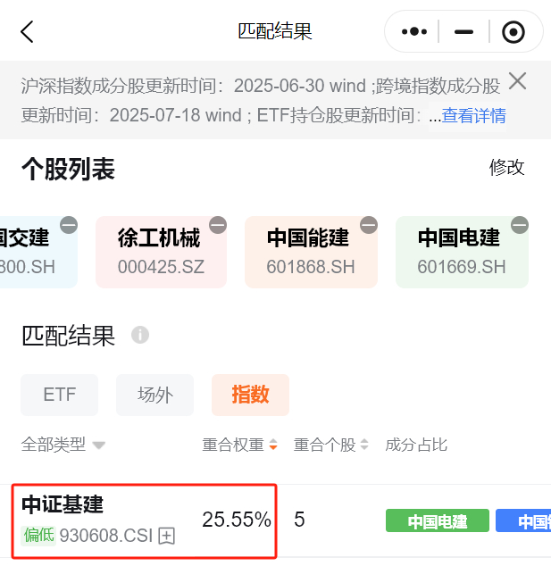 中国能建在水电工程施工市场份额超过30%,中国电建承担了我国 80%以上的河流规划及大中型水电站勘测设计任务,承担了我国大中型水电站 65%以上的建设施工任务,雅下水电工程或将为公司带来更多工程订单,增厚公司业绩。 上述成分股含量较高的指数——中证基建指数。