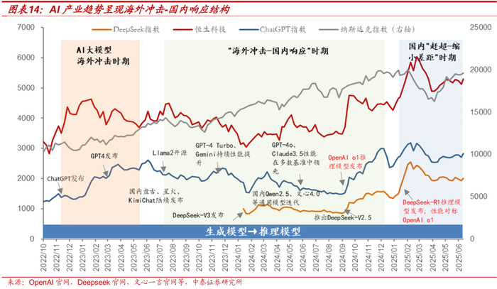以科技行业近年的发展为例,回看DeepSeek的崛起时点,可以发现很大程度上是源于海外AI大模型冲击后-响应结构。