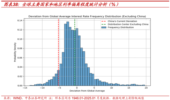 除图形走势的直接观察外,我们从全球主要国家的利率水平样本统计中也能得到两个数据验证支撑,我国利率水平很难长期脱离全球中枢低位运行: