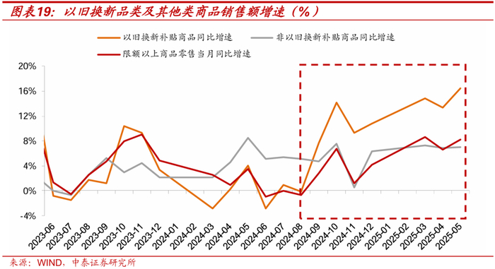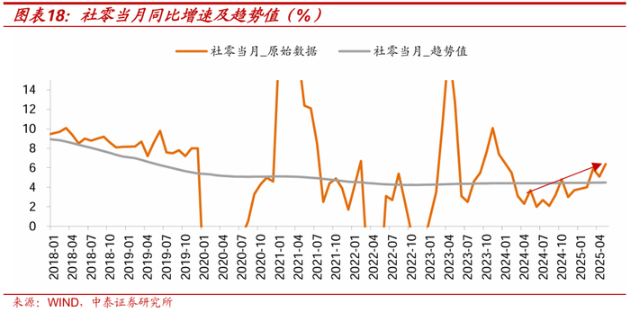 上半年总量数据中,表现最为亮眼的就是社零,其中以旧换新国补成为撬动消费的重要解释原因。去年三季度社零当月同比增速基本触底(2024年8月当月同比增速2.1%),此后整体表现回升,在今年3月当月增速高于趋势值,总量数据上修复动能较强,5月增速高于趋势值接近2个百分点,而根据商务部数据,消费品以旧换新拉升一季度社零总额增速1.6个百分点,这一撬动效应比较接近。