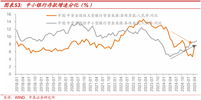 2)大行和小行资负差的问题:2024年6月以来出现的现象是“存款小行化”,小行吸储规模大而信贷投放弱,更多资金流向金市部门投债。