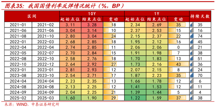 但相比来说,对应到我国情况实际上是比较特殊的,利率从21年开始至今流畅地下行了3年多,但是并没有明显的反弹,从统计数据来看,以10Y国债利率反弹情况为例,在利率下行周期我国很少有超过两个月的反弹行情,平均反弹天数在30天左右,平均幅度仅为18BP。