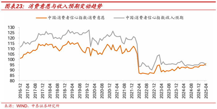 比如,非国补板块的潮玩、美妆背后的新消费趋势,包括假期和周末旅行等服务消费都在各自的细分领域,都具有需求释放动力和潜能,形成消费领域的再平衡,反映在居民消费意愿的边际提升,截至今年4月消费意愿指数已上升至96.10,位于23年以来的最高水平。