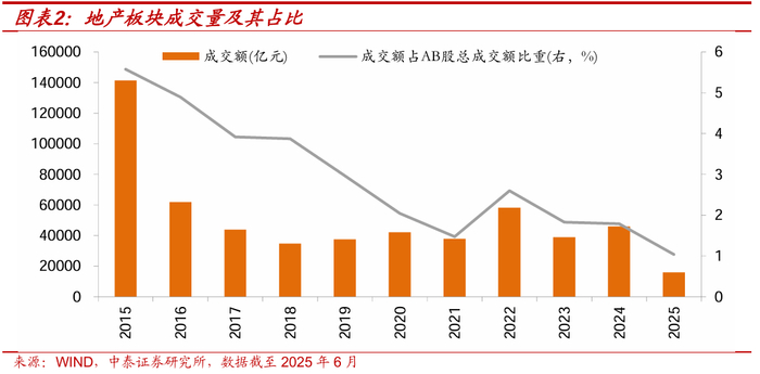 一是A股层面地产链股票成交量占比在逐步减少,对行情的贡献力量在逐步下降,2015年以来,地产板块的成交量占比从5.58%下降至2025年的1.04%,在上证指数中的权重也从2016年的4.32%下降至最新的1.17%;