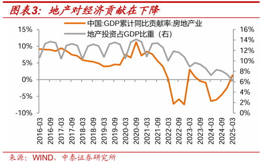 二是经济层面地产波动对GDP的影响逐步减少,新经济板块的此消彼长,地产投资占GDP比重在2020年以后逐步下滑,地产对GDP的贡献率也在经历了2016-2020年期间的大幅正贡献到2022年以后的负贡献,目前回归到水平线上下波动。