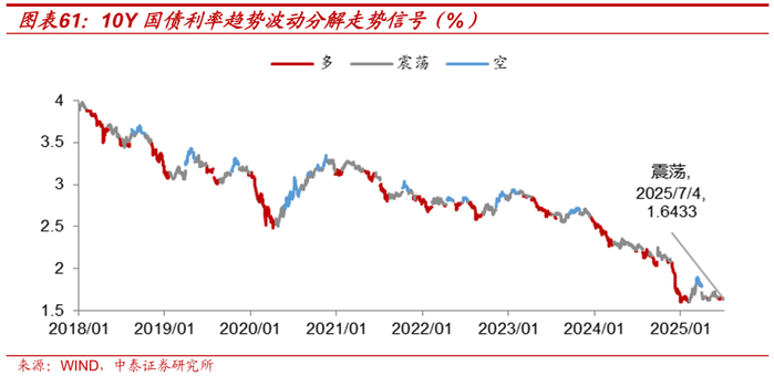 一方面以TL为例,从日线级别来看,当前DIF和DEA在0轴上方形成两线缠绕,市场偏多震荡运行,价格K线整体在布林带上轨与中轨之间,J值短期上冲,RSI数值上处于偏多水平;另一方面,对10Y国债利率进行趋势、波动分解以判断运行方向,技术信号显示当前处于多转震荡节点,前期做多上冲力量或边际减弱。