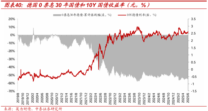 2) 德国0票息的30年国债的深度亏损:2019年8月德国0票息发行30年国债,当时10年德债已经进入负利率区间,从发行和认购预期来看,投资者多半是期望市场进入更深的负利率区间,获取债券价格上涨的收益兑现,但实际情况是长端利率在19-21年都处于0%以下低位震荡,22年之后出现大幅上升,该只0票息30年德债进入深度亏损,至今(2025/7/4)累计跌幅55%,缩水近6成。