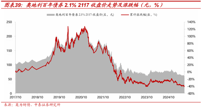 1) 奥地利百年债券的价格“大幅缩水”:2017年9月奥地利政府首次发行票息为2.1%的百年国债,从发行开始到2020年左右,债券价格基本表现上升趋势,但在2021年以后,伴随着美债、欧元区国债利率的持续攀升,该债券进入亏损区间,从2017年10月至今(2025/7/4)已累计亏损41%,相较最高点已经“缩水”74%。