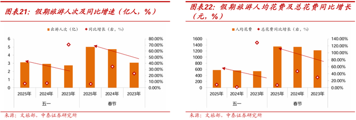 2)服务类消费需求的增长:节假日消费的逐步上台阶和“周末出游”的新消费模式,仍有潜能释放空间。例如,今年的五一假期根据文旅部门数据假期全国出游人次达3.14亿,同比增长6.4%,出游总花费同比8.0%,对比过去三年的同期假日出行,2023年以来无论是出行人次还是人均花费均保持正增,这也是我们能够在数据层面看到的出行意愿边际提升。