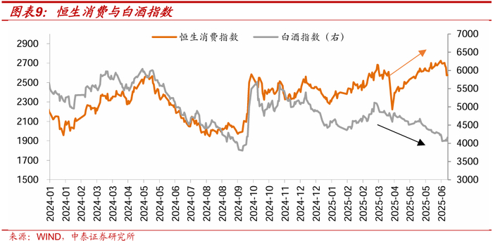 第二我们也可以观察剔除白酒后的消费指数。白酒本质上也是消费中的“旧经济”,而以恒生消费为代表的不含白酒的消费指数今年以来也表现更为优异,关税冲击之后,4/8-6/11恒生消费指数涨幅22.55%。
